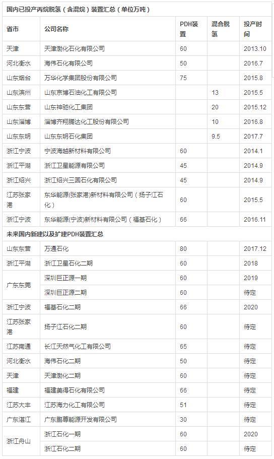 近年来,丙烷脱氢工艺在中国迅速发展,产能扩张速度惊人,逐渐成为丙烯重要来源之一。自2013年10月,随着天津渤化60万吨/年的丙烷脱氢装置投产运行,丙烷脱氢装置在国内正式拉开序幕。此后的几年里,丙烷脱氢装置在国内遍地开花,迅速发展,主要集中在华东的江浙地区、华北地区以及山东地区,而且近两三年混合烷烃脱氢这种更加灵活的装置在山东地区陆续投产运行。至今,国内丙烷脱氢(含混烷)制丙烯总产能达到513.5万吨。但是从下表可以看出,华南地区尚无丙烷脱氢装置,深圳巨正源丙烷脱氢装置建成后,将填补华南地区丙烷脱氢制高性能聚丙烯及下游加工项目的空缺,给当地化工企业提供优质的化工原料。