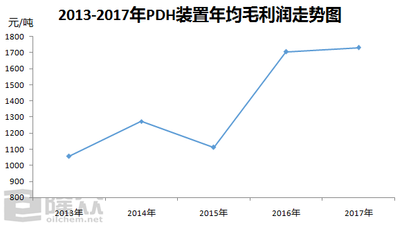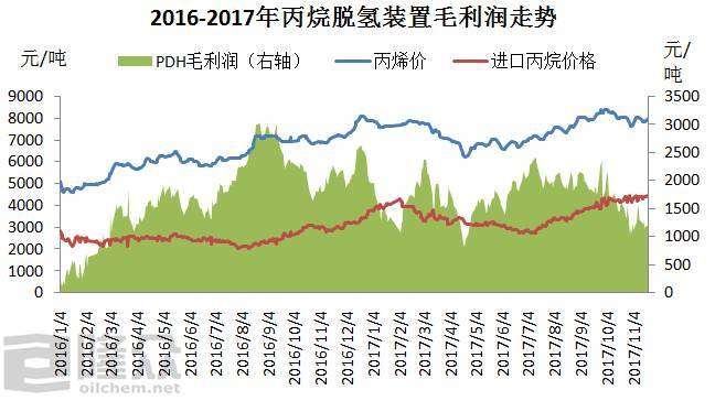由上图可见,2016-2017年丙烷脱氢毛利润表现乐观,装置均无亏损情况,尤其在夏季,受原料气丙烷价格低位,使丙烷脱氢装置获利更为理想。华南地区是国内进口气集中地,而丙烷脱氢装置,工艺来源于国外,原料气丙烷也基本依赖进口,装置在华南投产建设,原料提供方便。目前,华南地区的进口丙烷资源多作为工业气或者搭配丁烷或者搭配当地炼厂气今日民用市场,均是作为提供热值的燃料,据隆众数据监控,2016年华南进口毛利润在257元/吨左右,2017年至今进口毛利润在194元/吨左右,相比丙烷脱氢装置利润优势十分明显。
