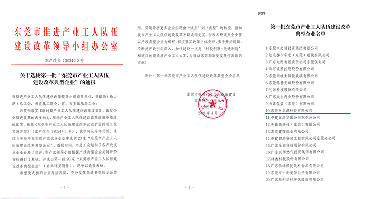 近日,东莞市推进产业工人队伍建设改革领导小组办公室(以下简称“市产改办”)发布第一批20家“东莞市产业工人队伍建设改革典型企业”名单。其中,东莞巨正源科技有限公司荣耀登榜,成功入选为产改典范企业。