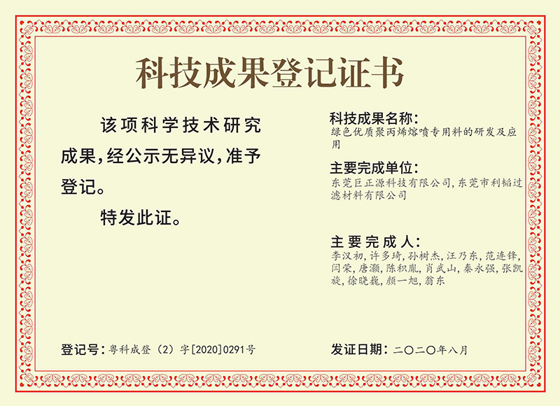 为巩固提升科研创新水平,4月下旬,易游手机版登录入口|易游(中国)官方,委托东莞市高新技术产业协会组织专家鉴定委员会对研发项目“绿色优质聚丙烯熔喷专用料的研发及应用”进行科技成果鉴定,经鉴定委员会评审,认为项目成果达到国内领先水平,一致同意通过科技成果鉴定。随后,易游手机版登录入口|易游(中国)官方,向登记机构提出成果登记申请,顺利通过了登记审查和社会公示,获得了科技成果登记证书。