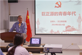 5月14日晚,巨正源党总支举办纪念五四运动100周年专题讲座,由王立贵总裁作题为“巨正源的青春年代”主题报告,公司领导高管、直属支部全体党员、青年员工约100人参加了活动。广物控股集团党群工作部和人力资源部总经理杨丽芳莅临指导。