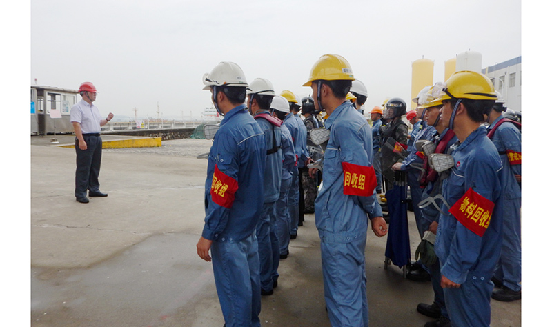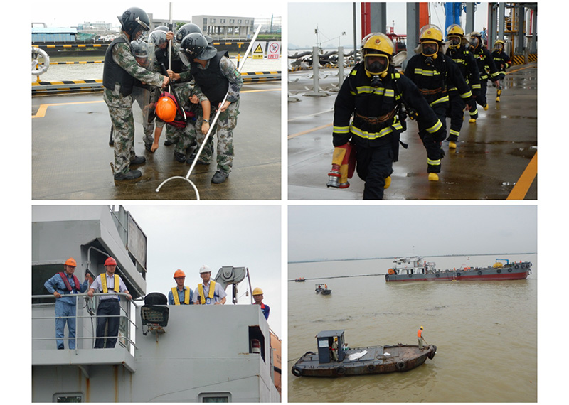 演练模拟一名恐怖分子潜入鸿源码头实施破坏,遭到破坏的油品管线大量物料喷射而出并流入江面。情况十分危急,在接到现场操作人员的报警信号后,鸿源码头应急指挥中心立即启动应急预案,迅速组织警消力量对恐怖分子实施围捕,同时组织抢险救援组进行堵漏、灭火救援组现场掩护救援、医疗救护组抢救受伤人员、物料回收组对地面物料回收、工程抢修组检查现场设备情况、疏散警戒组拉起警戒……此外,鸿源码头及时报告海事部门和相邻单位应急中心,船舶调度通知金骅海防污公司前往相关水域做好海上溢油警戒和防污处置。