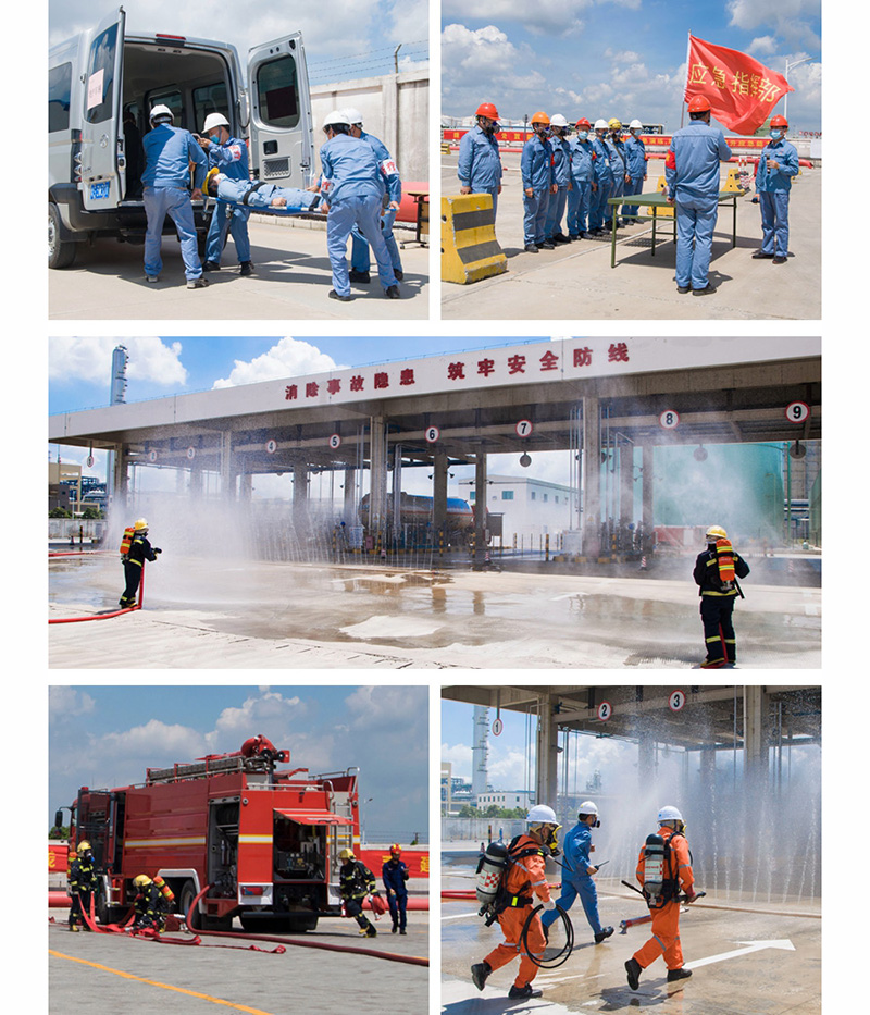 上午10:00,沙田镇委副书记袁树坚宣布演练正式开始。此次演练现场模拟移动式压力容器在装卸台进行丙烷充装时发生大量泄漏,一名充装员工冻伤,因泄漏量大无法靠近,其他员工立即将受伤员工转移至安全区域,并先后启动装置级、公司级事故应急救援预案,公司领导接报后立即赶往事故现场,成立现场指挥部,生产处置组、疏散组、警戒组、救援组、消防组、后勤组、工程抢险组等按照各自的应急处置职责迅速开展救援工作。